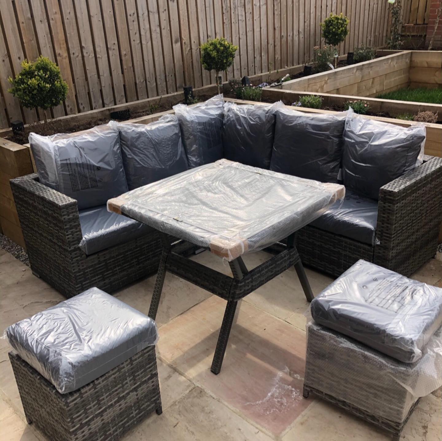 Atrina Compact Grey Rattan Corner Garden Sofa Dining Table Set